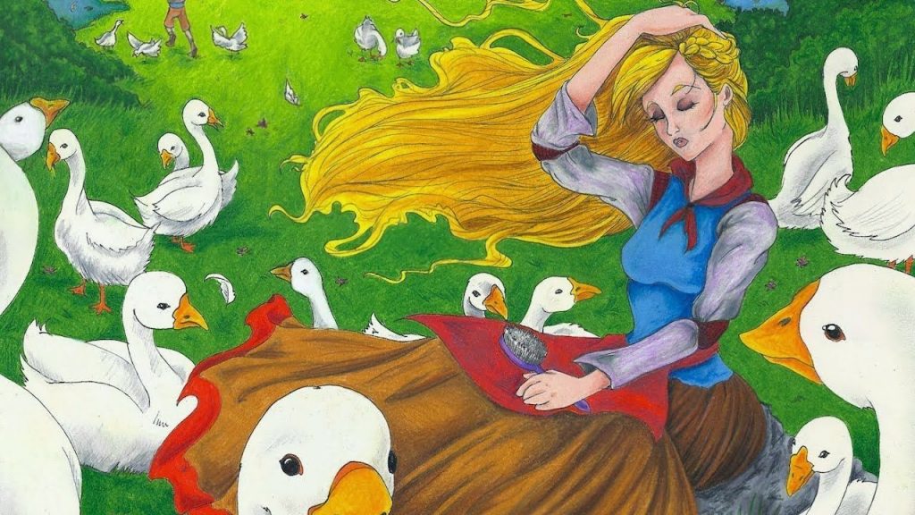 Deodată, de afară se auzi o larmă mare: se întorceau gâştele de la păscut şi scoteau gâgâiturile lor răguşite. Puţin după aceea, intră-n casă şi fata şi-i dădu bineţe maică-si. Bătrâna însă de-abia îi răspunse şi se mulţumi să dea doar din cap de câteva ori.