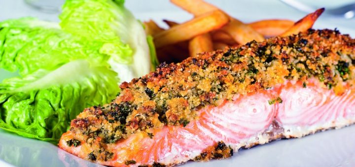 Ingrediente: 350 g file de somon 2 linguri cu pesmet 50 g nucă 2 căței de usturoi 1 lingură cu ulei de măsline mărar 2 linguriţe cu muştar sare piper Mod de preparare: Rumenește puţin...