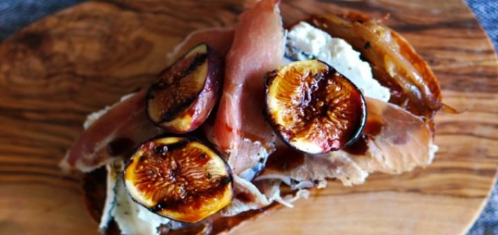 Bruschete cu ceapa caramelizata, branza, smochine si prosciutto