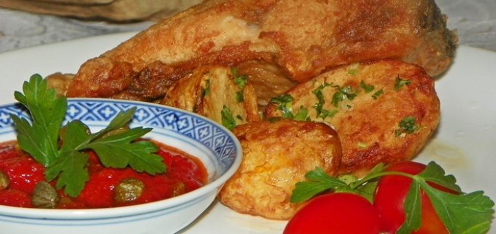 Ingrediente: Pentru prajit: 4 felii crap, faina, ulei, sare Pentru sos: 3 linguri cu capere, 4-5 rosii, 2-3 catei de usturoi, 1/2 zeama de lamaie, 1 lingurita rasa zahar, 2 foi de dafin, ulei de...